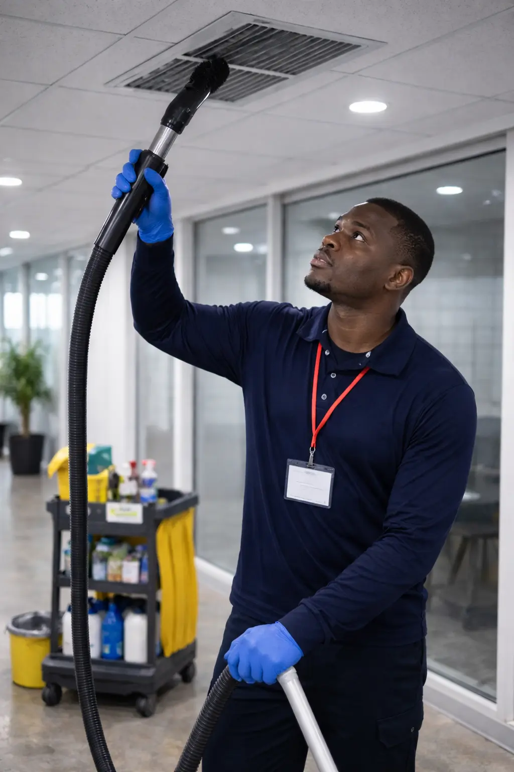 Our services include routine janitorial cleaning for offices, breakrooms, washrooms, and shared spaces; sanitization and disinfection of high-touch and shared equipment areas; optional day porter support for high-occupancy or multi-shift operations; and deep seasonal cleaning to address dust accumulation, floor buildup, and hard-to-reach areas.
