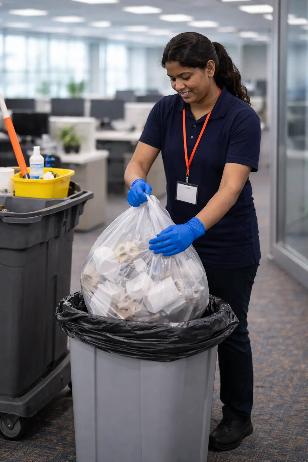 Maintains office spaces, break areas, and washrooms within industrial and logistics environments to support workplace cleanliness and safety.